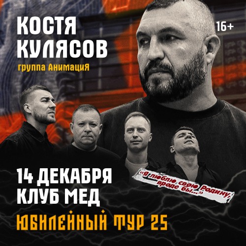 Драйвово, дерзко и в самом электрическом звучании! Костя Кулясов и группа «АнимациЯ» представят программу: «Презентация нового альбома «Отрицательное время» и хиты, проверенные временем» в рамках юбилейного тура «АнимациЯ 25 лет».